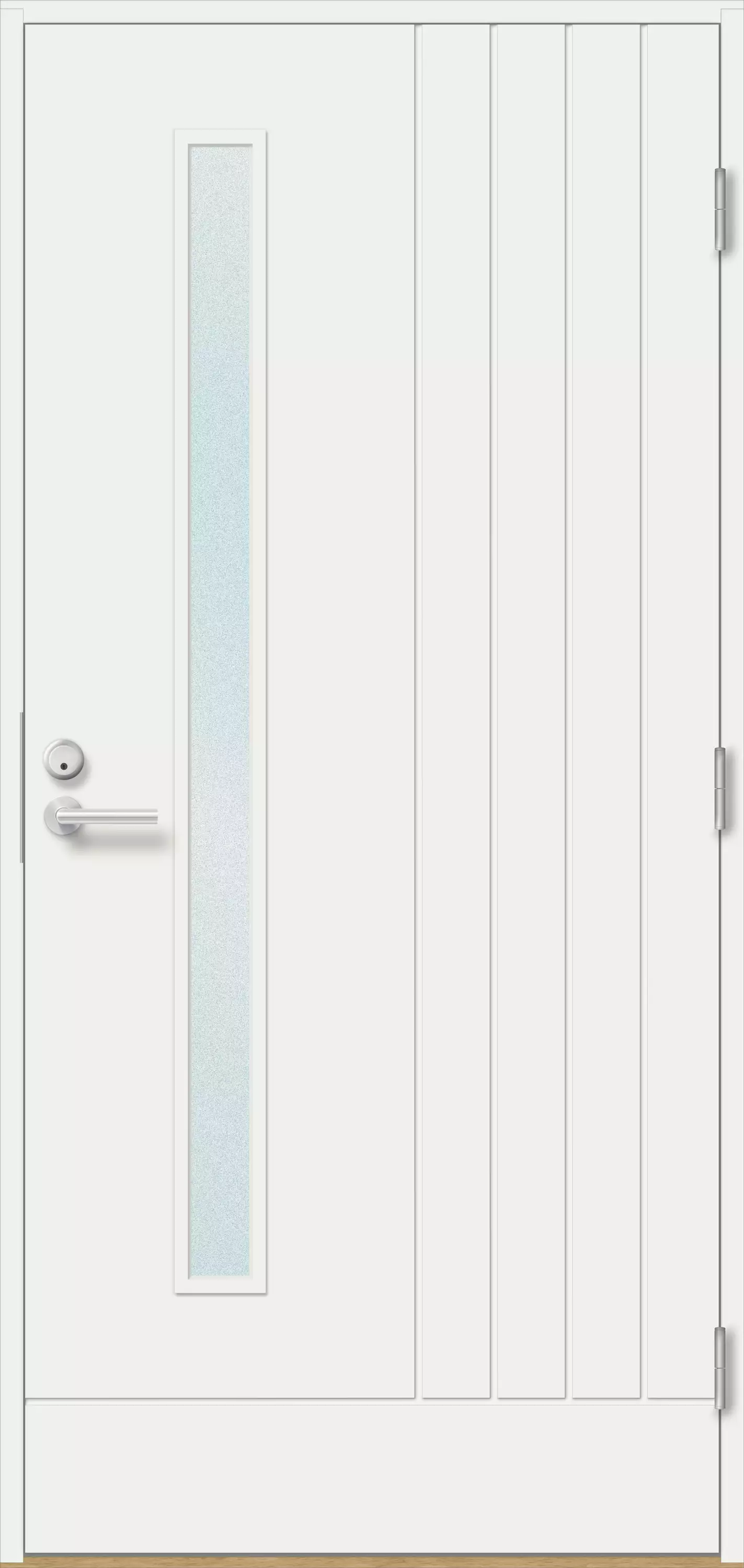 Henni on moderni ulko-ovi, joka kestää aikaa ja vaihtelevia sääolosuhteita. Kapea, korkea lasi tuo sisään luonnonvaloa ja keventää ilmettä, kun taas uritettu pinta lisää ryhtiä kokonaisuuteen. Oven alumiinivahvisteinen, 78 mm paksu rakenne ja kaksinkertainen tiivistys pitävät kylmän loitolla ja lämmön sisällä. Henni on suunniteltu koteihin, joissa arvostetaan energiatehokkuutta, kestävyyttä ja kotimaisen työn laatua.Ovilevy | Alumiinijäykistetty, kehysrunkoinen, eristetty 78 mm rakenne