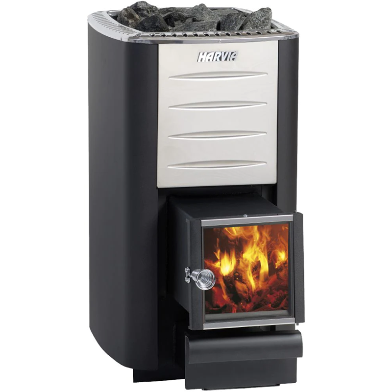 - Puulämmitteinen Harvia M3 SL -kiuas seinään upotettavalla lasiluukulla pieniin perhesaunoihin