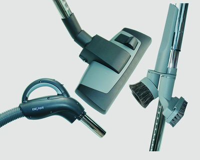 Beams 10 meters Deluxe-städtrasakan är handdrogad. Leveransen inkluderar en 10 meters slang, slanghållare, metallisk teleskopisk arm, Deluxe-golvmattmunstycke, 3 små munstycken samt munstyckshållare. Sugkraften kan minskas med hjälp av övertrycksventilen på handtaget.