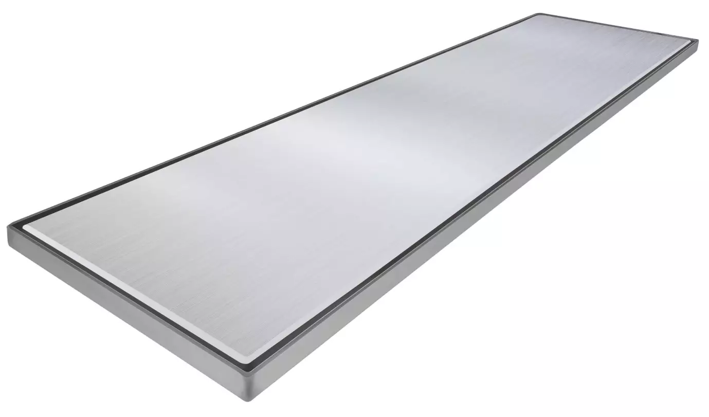 PP-Produkten lång golvränna täcklock är en modern blickfångare i badrummet. Produkter inkluderar en installationsram av rostfritt stål samt locket antingen obehandlat eller lackerat i svart.