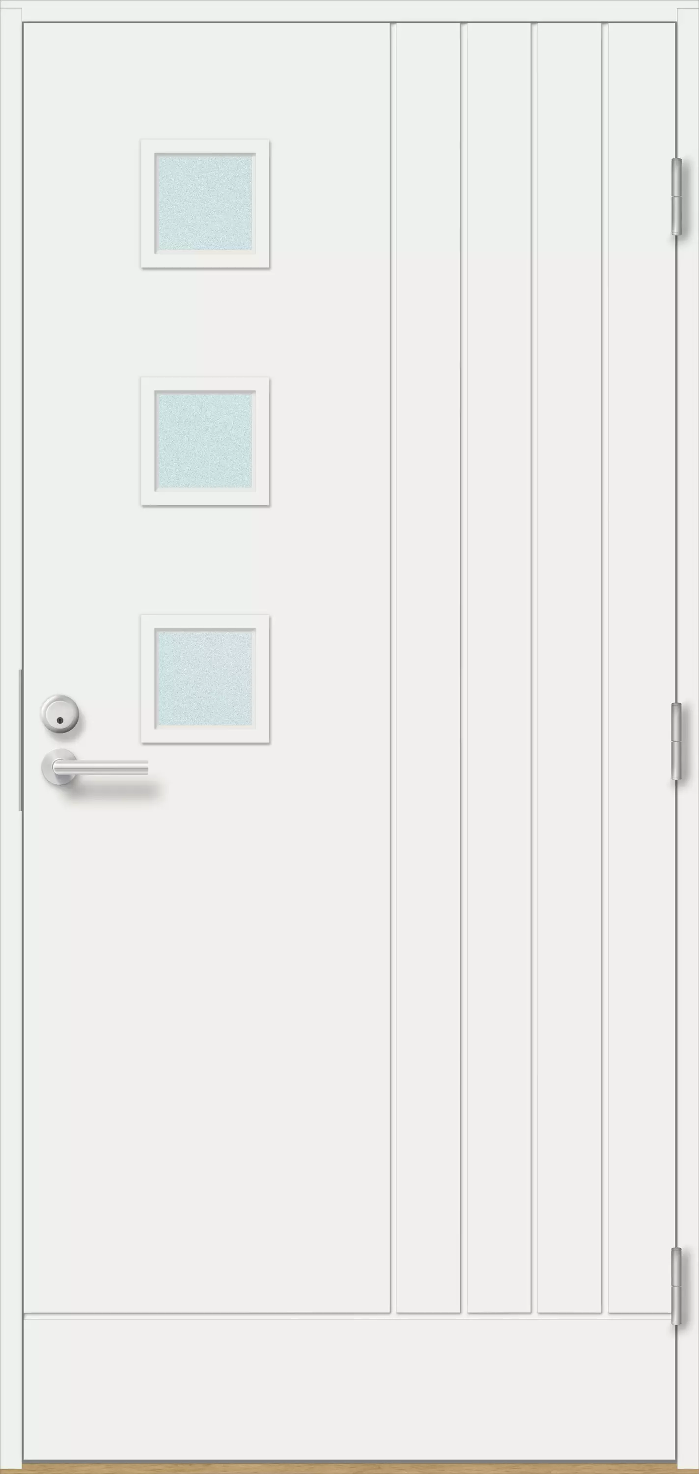 Iida – en tydlig och energieffektiv ytterdörr. Iida är en modern ytterdörr som tål tidens prövningar och varierande väderförhållanden. Tre små fyrkantiga fönster placerade i dörrens överdel ger ljus och lätthet till entréns utseende, medan den strukturerade ytan ger en känsla av stil. Dörrens aluminiumförstärkta, 78 mm tjocka konstruktion och dubbla tätningar håller kylan borta och värmen inne. Iida är utformad för hem där energieffektivitet, hållbarhet och kvalitetsarbete värderas.