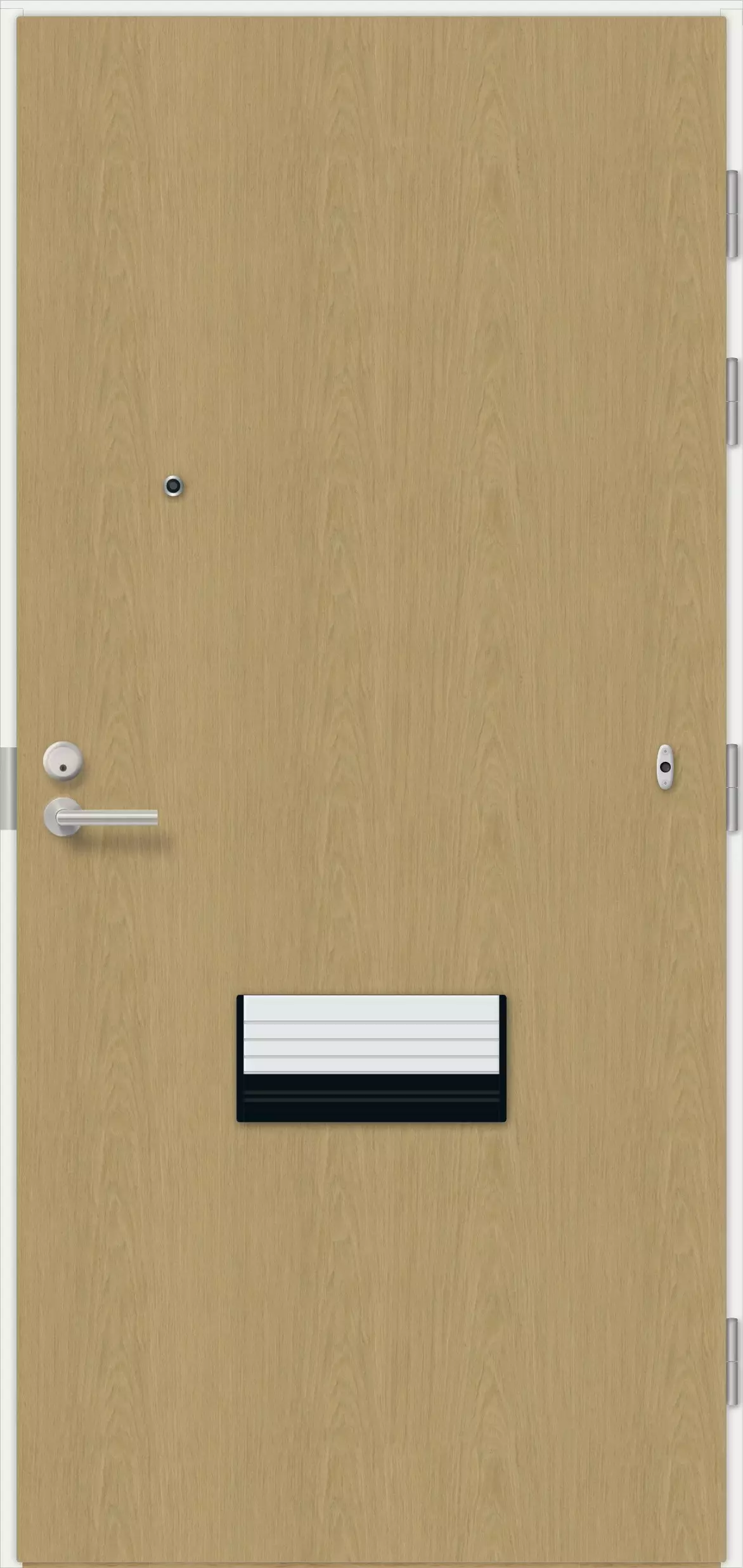 - Packning: Dubbelpackning, grå 10 mm silikonpackning i dörrbladet och karmen. Dörrbladet har brandpackning.