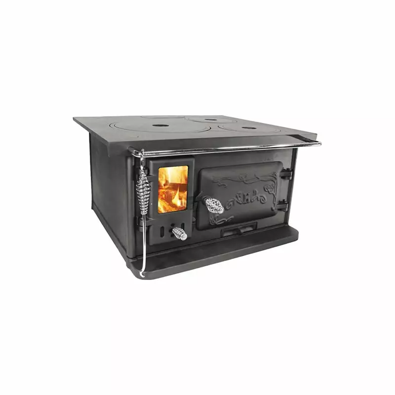 En traditionell liten gjutjärnvedspis. Stället kan muras, eller väljas som tillbehör till spisen. Finns med brännkammare antingen med glaslucka eller sluten lucka.