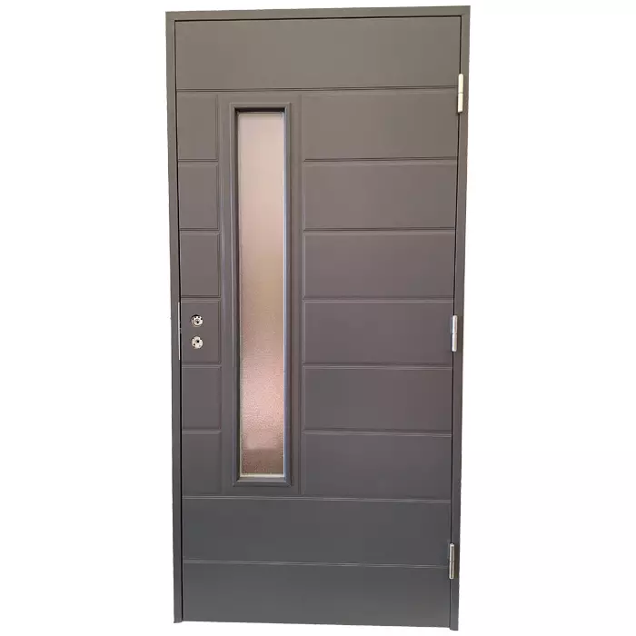 Den mörkgrå Helena ytterdörren har en lång vertikal glasruta, utsidan är räfflad och insidan är slät. Tröskeln är av hårdträ. Alla våra ytterdörrar har HDF-yta och är aluminiumförstärkta. Helena ytterdörrar är lågenergibyggnader.