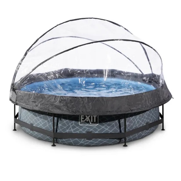 Beställ nu med leverans från Lakkapää stengrå simbassäng med ram och överdrag för slvaldande bad i sommarvärmen! Rund EXIT Stone pool, vars mått är 300 cm x 76 cm, med stenmönster och ram. Filterpump och skyddsöverdrag följer med. Poolens robusta och kraftiga ben för stabilitet för många år framåt.