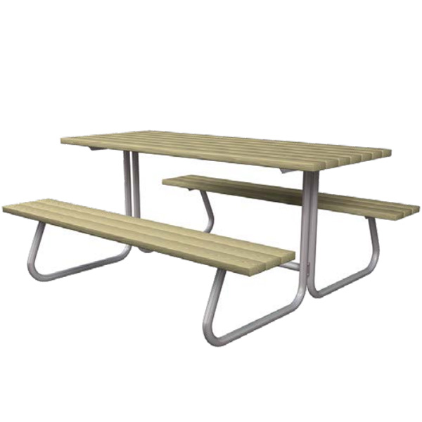 Bord på fastighets eller fast stugans gård, bänkar av trä på båda sidor av bordet. Mycket hållbar stomme av varmförzinkat stålrör, trädelarna av tryckimpregnerat trä som tål väderförändringar. Säkert hållbart utebord med stomme av metall på gården från Lakkapää.